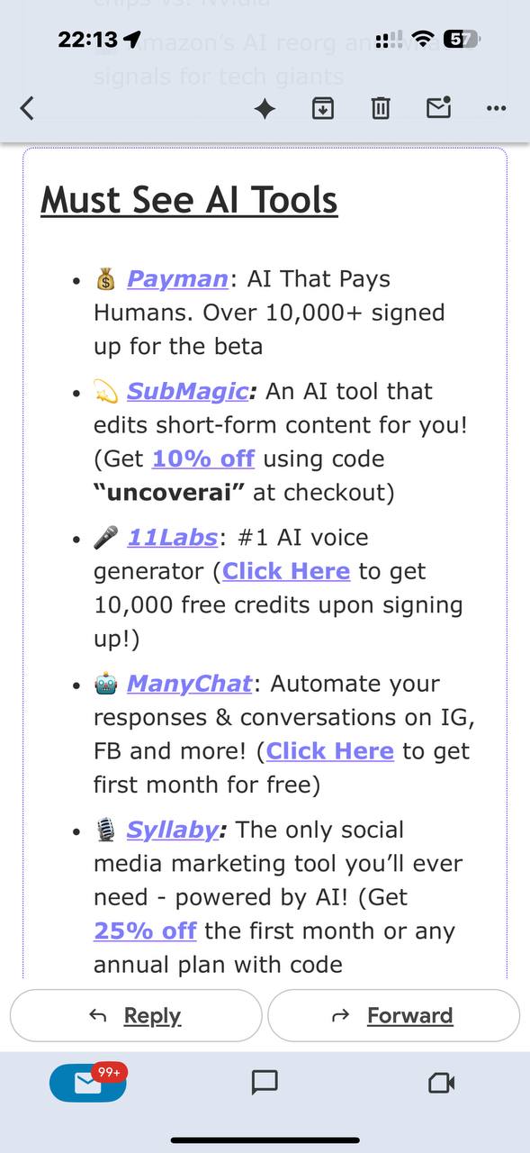 "text": "Must See AI Tools\n\n• Payman: AI That Pays Humans. Over 10,000+ signed up for the beta\n\n• SubMagic: An AI tool that edits short-form content for you! (Get 10% off using code \"uncoverai\" at checkout)\n\n• 11Labs: #1 AI voice generator (Click Here to get 10,000 free credits upon signing up!)\n\n• ManyChat: Automate your responses & conversations on IG, FB and more! (Click Here to get first month for free)\n\n• Syllaby: The only social media marketing tool you'll ever need - powered by AI! (Get 25% off the first month or any annual plan with code\n\nReply\n\nForward"