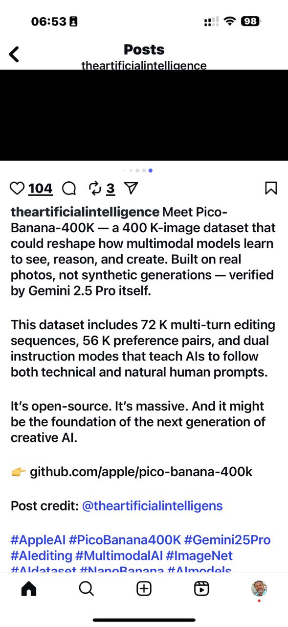 "text": "06:53\n!! 98\n<\nPosts\ntheartificialintelligence\n\n104 3\n\ntheartificialintelligence Meet Pico-Banana-400K โ a 400 K-image dataset that could reshape how multimodal models learn to see, reason, and create. Built on real photos, not synthetic generations โ verified by Gemini 2.5 Pro itself.\n\nThis dataset includes 72 K multi-turn editing sequences, 56 K preference pairs, and dual instruction modes that teach Als to follow both technical and natural human prompts.\n\nIt's open-source. It's massive. And it might be the foundation of the next generation of creative AI.\n\n๐ github.com/apple/pico-banana-400k\n\nPost credit: @theartificialintelligens\n\n#AppleAI #PicoBanana400K #Gemini25Pro\n#Alediting #MultimodalAI #ImageNet\n#Aldataset #NanoRanana #Almodels"